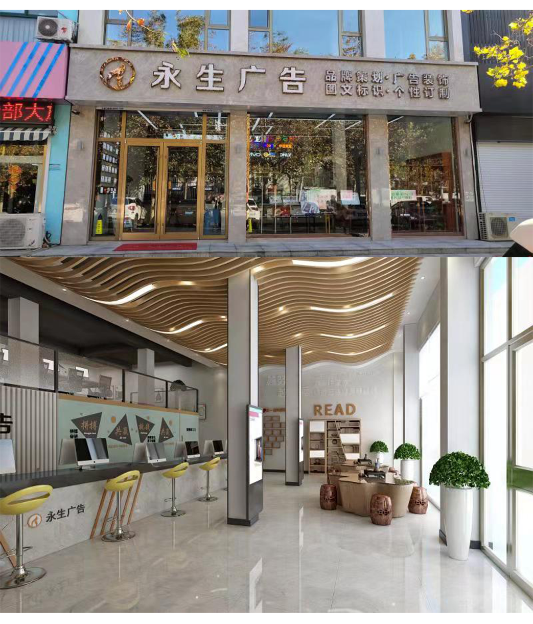 公司自有數(shù)碼沖床設(shè)備、500W光纖機、高精度大幅面噴繪機、寫真機、UV機、多種大小型雕刻機、吸塑機、全自動圍字機、自動開槽機、激光焊接機、拋光機等生產(chǎn)加工設(shè)備,擁有完善的設(shè)計團隊、技術(shù)團隊、施工團隊、售后團隊,可為廣大客戶提供室內(nèi)裝修、店招門頭、精神堡壘、黨建標識、標識標牌、宣傳欄、LED顯示屏、警示標識、精品字、證卡胸牌、證書獎杯、燈箱、桌牌、定制禮品、展具、噴印等多種專業(yè)廣告服務...